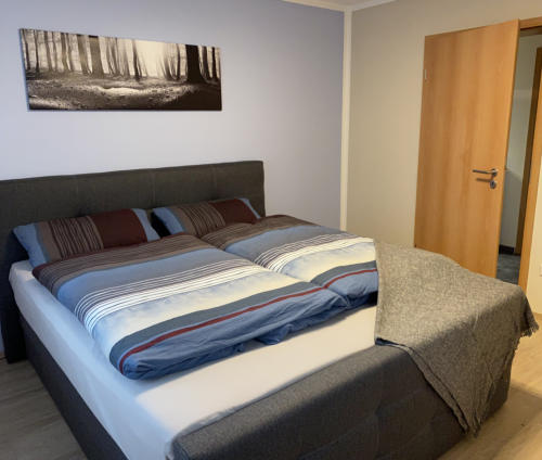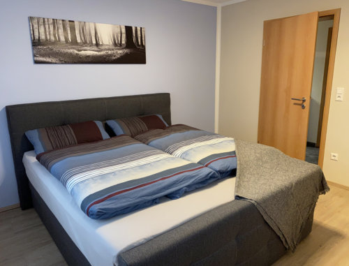 Schlafzimmer mit Boxspringbett und geräumigem Schrank
